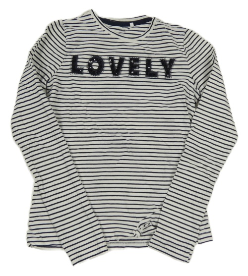 Tmavomodro-bílé pruhované triko s nápisem z flitrů Name it