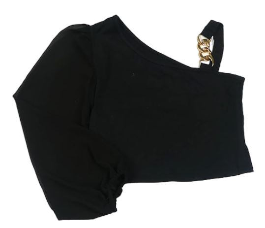Černé crop asymetrické triko se zlatým řetězem a šifonovým rukávem SHEIN