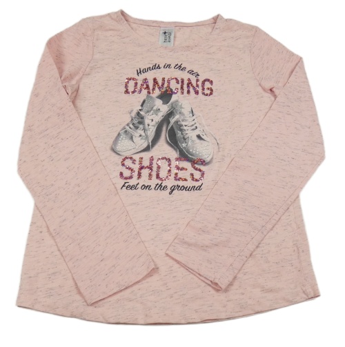 Světlerůžovo-černé melírované triko s botami s pecičkami a nápisy a flitry C&A