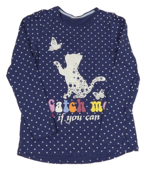 Tmavomodré květované triko s kočičkou a nápisy Kids