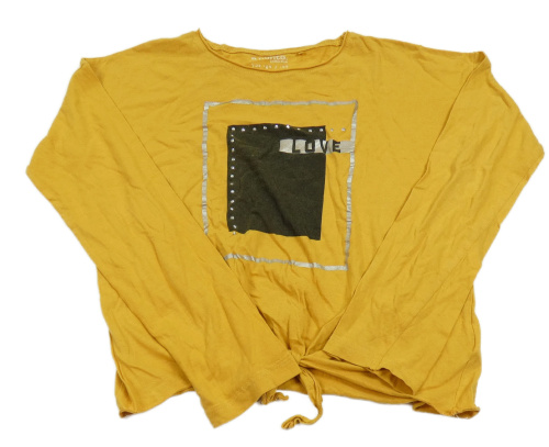 Okrové crop triko s nápisem a kamínky a uzlem