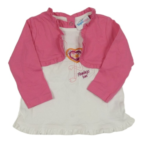 Bílé triko s plameňákem a růžovým bolérkem a volánky Topomini