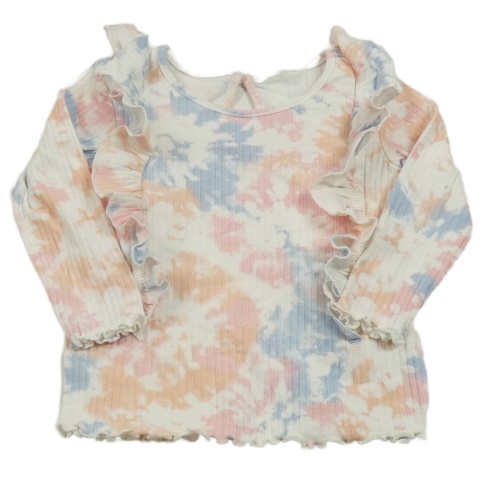 Bílo-modré-růžovo-broskvové batikované žebrované triko s volánky