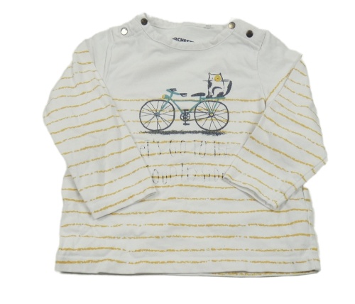 Bílo-okrové pruhované triko s kolem a kočičkou a nápisy ORCHESTRA