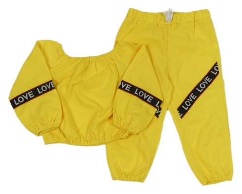 2 set - žluté crop triko s nápisy + žluté kalhoty s nápisy