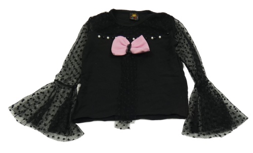 Černé triko se síťovanými puntíkatými rukávy a mašlí