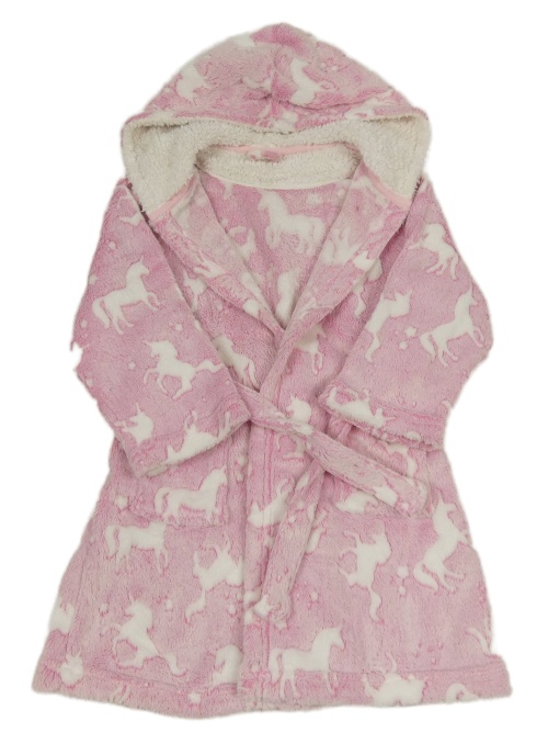Světlerůžový chlupatý župan s jednorožci a kapucí Nutmeg