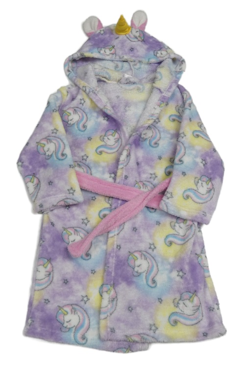 Fialovo-žluto-světlemodrý plyšový župan s jednorožci a kapucí