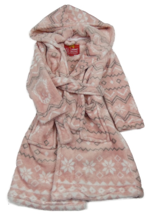 Růžovo-šedo-bílý plyšový župan s norským vzorem a kapucí