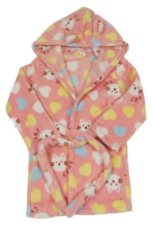 Růžový chlupatý župan s barevnými puntíky a kočkami a kapucí