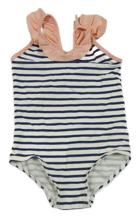 Bílo-tmavomodro-pudrové pruhované jednodílné plavky s volánkem