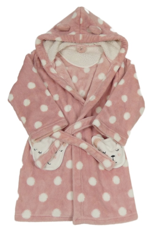Růžový žebrovaný puntíkatý chlupatý župan s medvědy a kapucí Nutmeg