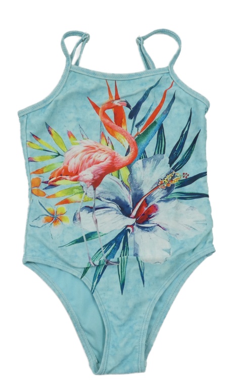 Mátovo-modré batikované jednodílné plavky s plameňákem WE