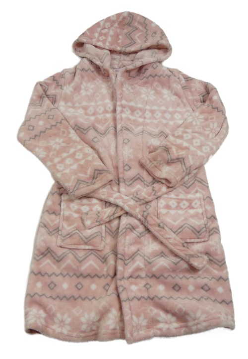 Světlerůžový chlupatý župan se vzorem a kapucí