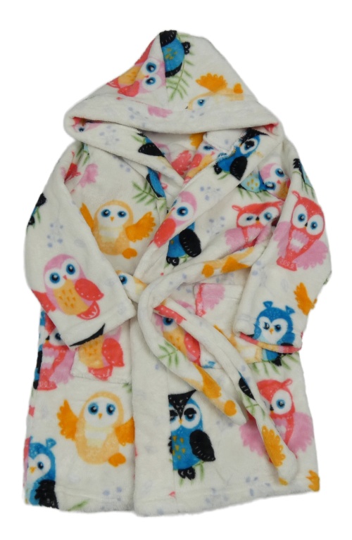 Smetanovo-barevný chlupatý župan se sovami a kapucí