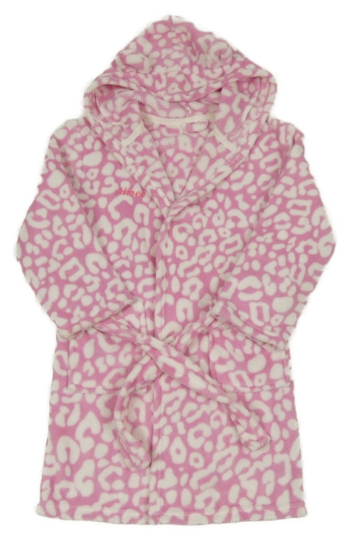 Růžovo-bílý plyšový župan s nápisem a leopardím vzorem a kapucí