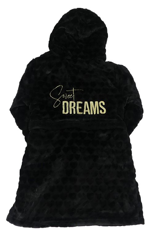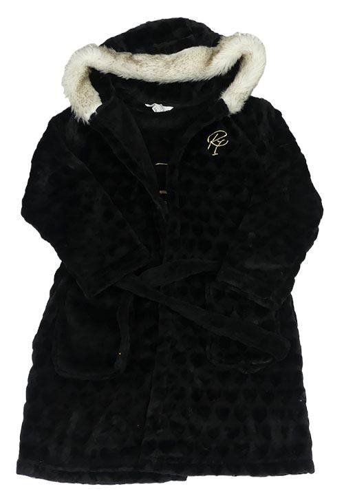 Černý plyšový župan se srdíčky a logem a nápisy a kapucí s kožešinou RIVER ISLAND