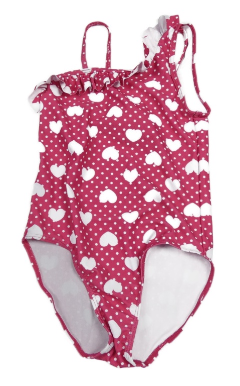Malinové puntíkaté jednodílné plavky se srdíčky a volánem