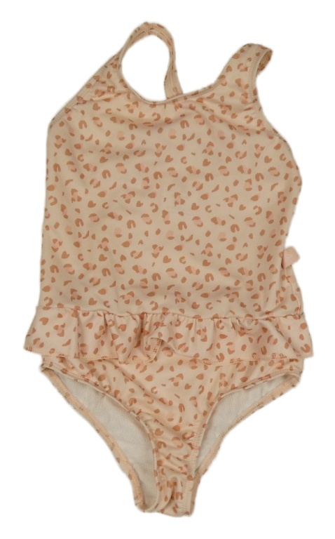 Pudrovo-cihlovo-světlerůžové vzorované jednodílné plavky s volánkem