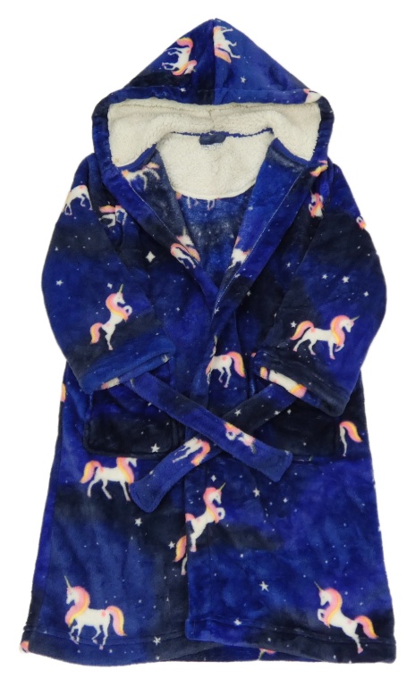 Tmavomodro-safírový plyšový župan s jednorožci a kapucí Bluezoo