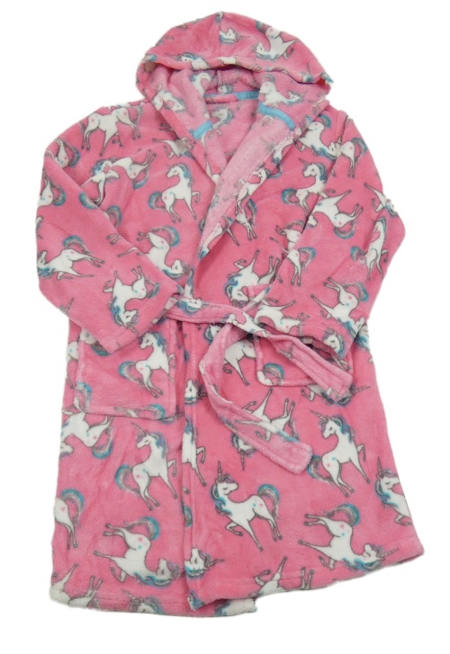 Růžový plyšový župan s jednorožci a kapucí