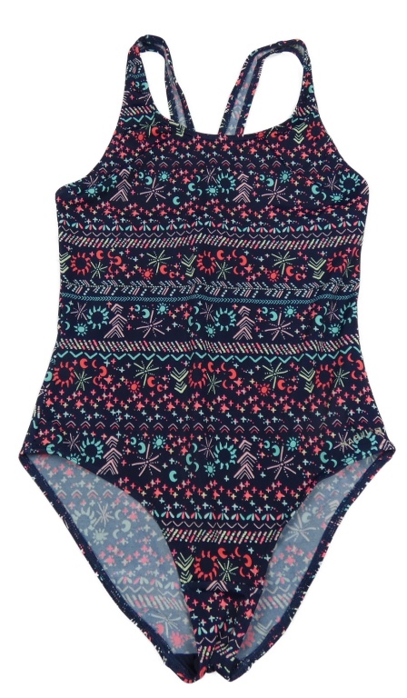 Tmavomodré vzorované jednodílné plavky s měsíci a sluníčky a hvězdičkami
