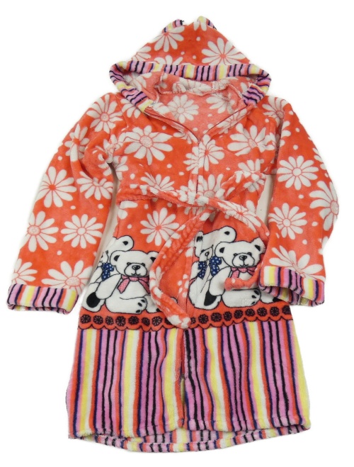 Jahodovo-pruhovaný plyšový župan s medvídky a květy a kapucí s oušky