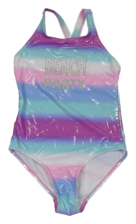 Modro-fialovo-růžové pruhované třpytivé jednodílné plavky s nápisem