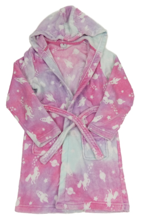Růžovo-světlemodrý vzorovaný chlupatý župan s jednorožci a kapucí