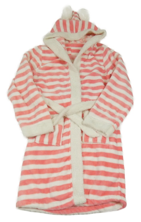 Růžovo-bílý pruhovaný plyšový župan s kapucí s oušky