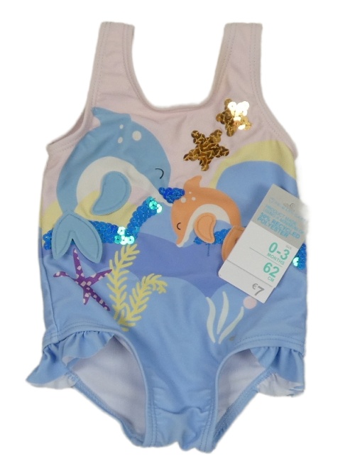 Nové - světlemodro/růžové jednodílné plavky s delfínky a flitry a volánky PRIMARK