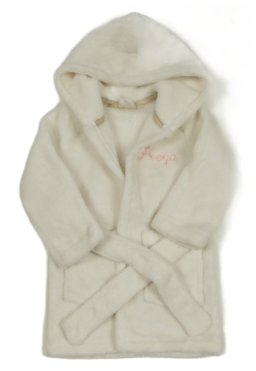 Bílý plyšový župan s nápisem a kapucí