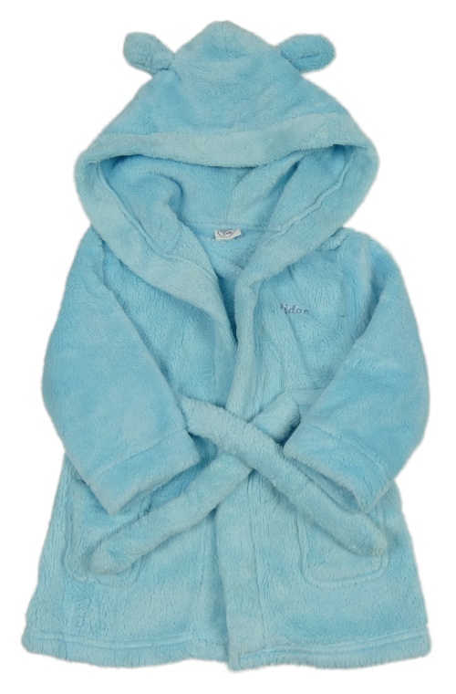 Azurový plyšový župan s nápisem a kapucí s oušky