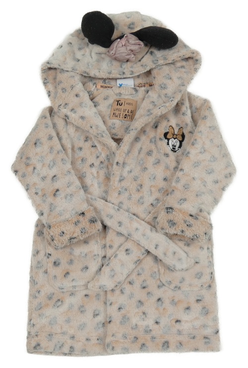 Světlerůžovo-šedý plyšový vzorovaný župan s Minnie a kapucí Tu
