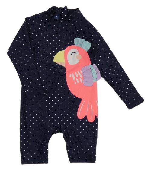 Tmavomodrý puntíkovaný UV overal s papouškem Topomini