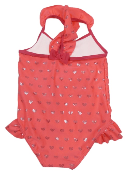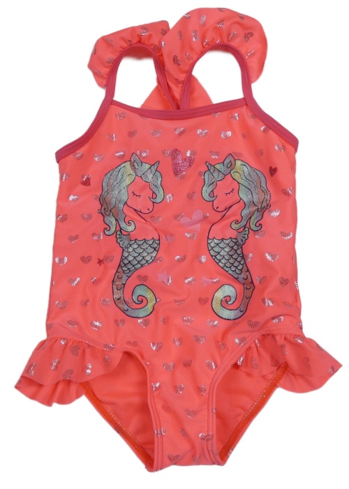 Neonově růžové jednodílné plavky se srdíčky a mořskými koníky a volánky