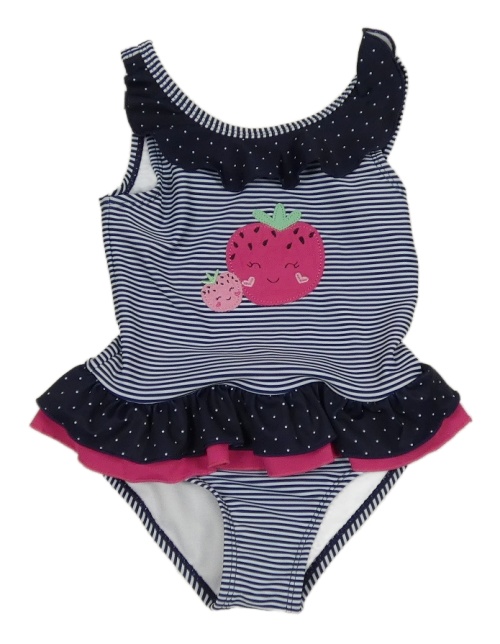 Tmavomodro-bílé pruhované jednodílné plavky s jahodami Topolino