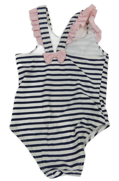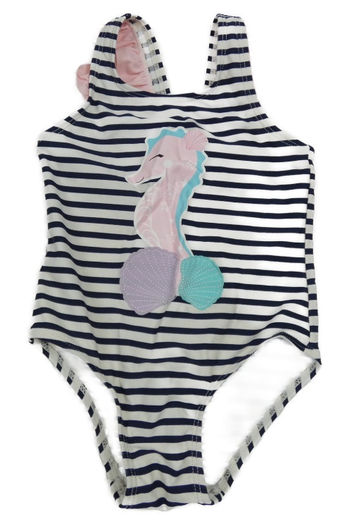 Bílo-tmavomodré pruhované jednodílné plavky s mořským koníkem