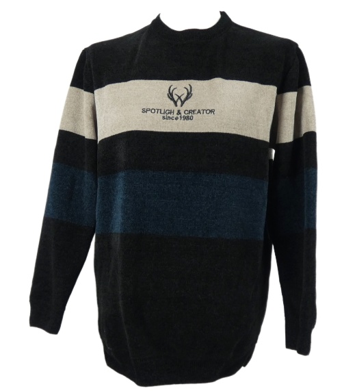 • Pánský černo-béžvo-tmavomodrý pruhovaný žinylkový svetr s logem