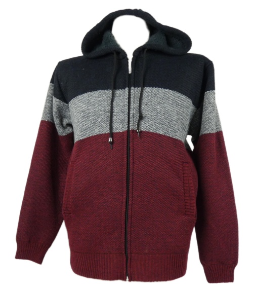• Pánský tmavomodro-šedo-vínový pruhovaný zateplený propínací svetr s kapucí