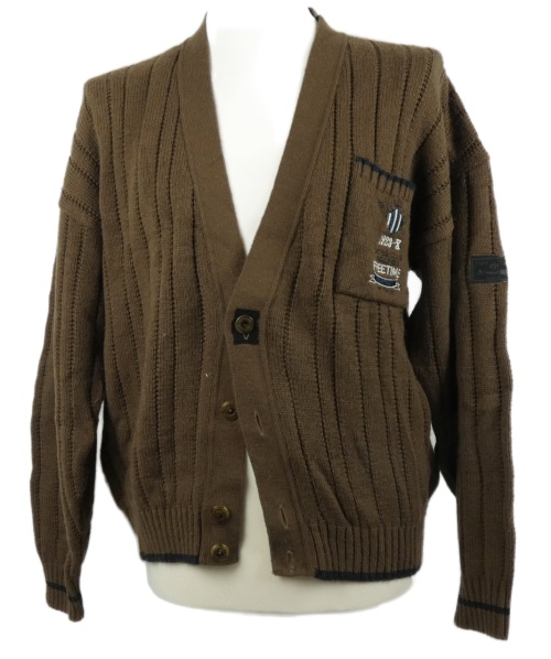 Pánský hnědý propínací vlněný svetr s nápisy Maser